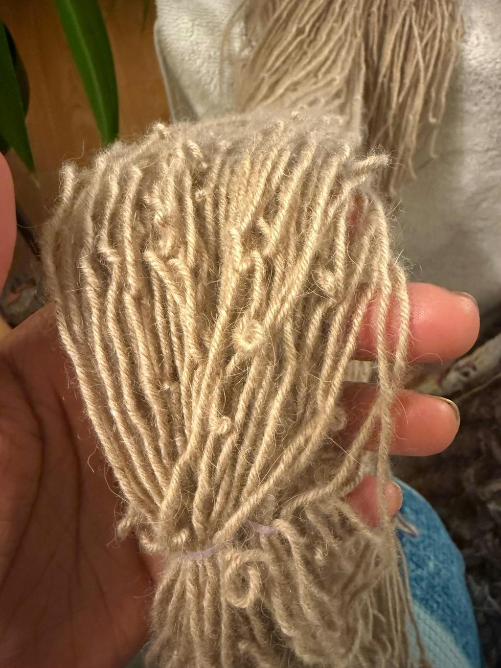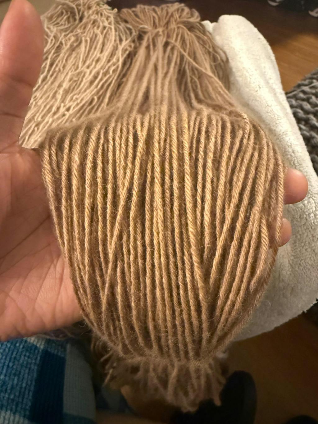 [Update]: The owner addressed the problem promptly and solved the issue with this skein. It ended up a small portion of the yarn was over spun and it wasn’t caught before shipment. He sent me a replacement one swiftly and this one was perfect! The new blonde skein acts and feels just like my initial tan skein and I am excited to use it in the future! I already have a pattern for it.